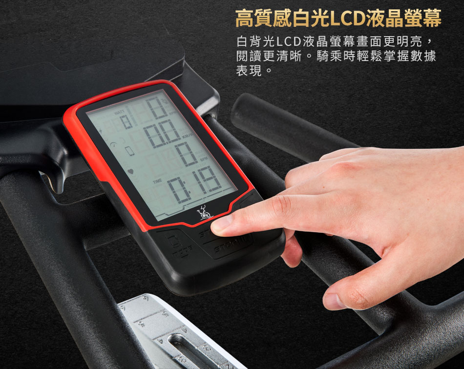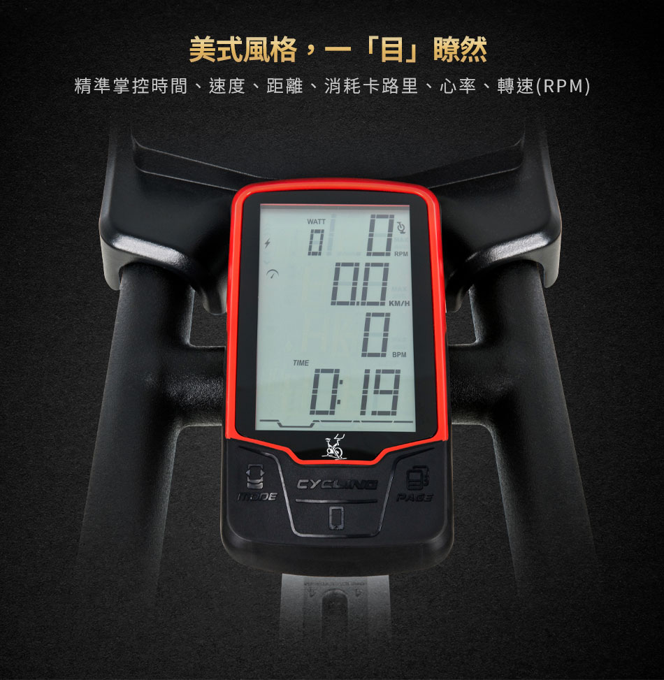 先是即時運動狀態,包括運動時間、卡路里、轉速、距離、速度與心率,內建無線心率接收器(選配),可精準計算心跳速度