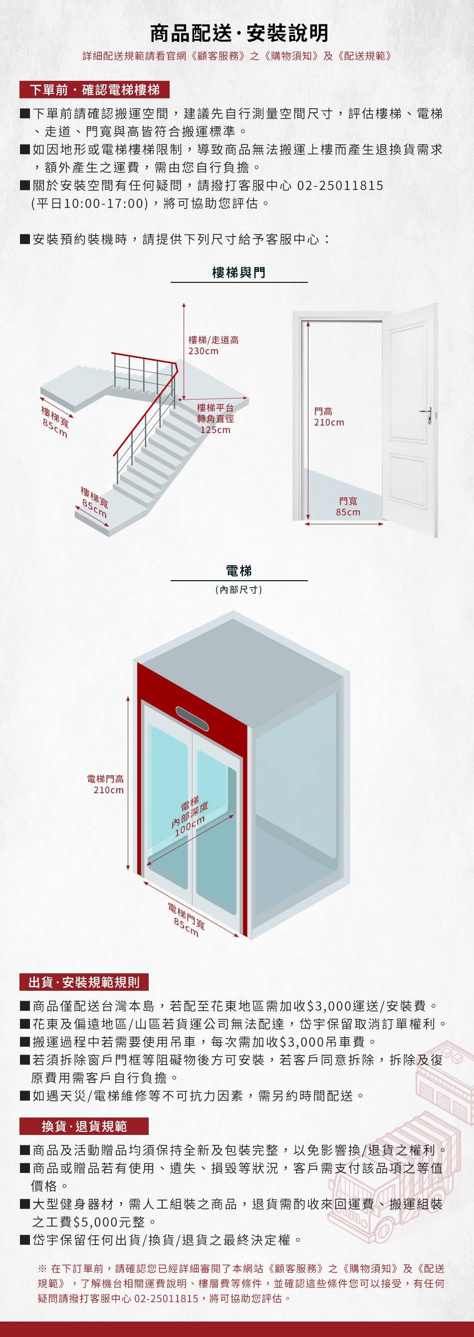 * 若因空間限制及障礙物導致無法搬運及安裝,SOLE保留取消訂單權利。