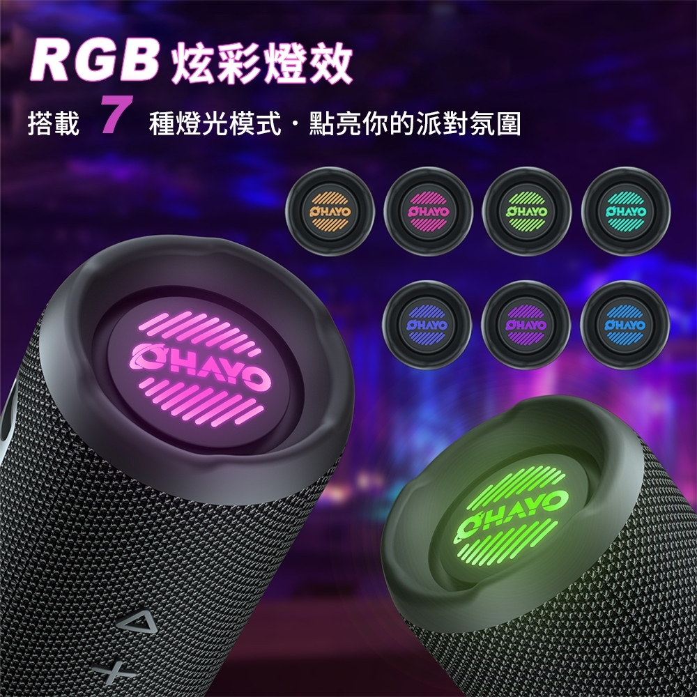 RGB 燈效內建 7 種模式,隨節奏閃爍變化,聲光合一,無論派對或聚會都能瞬間點燃氣氛。