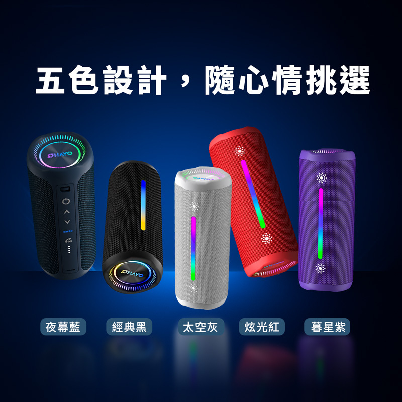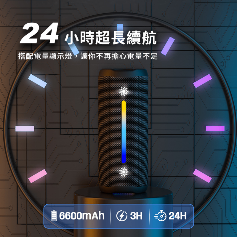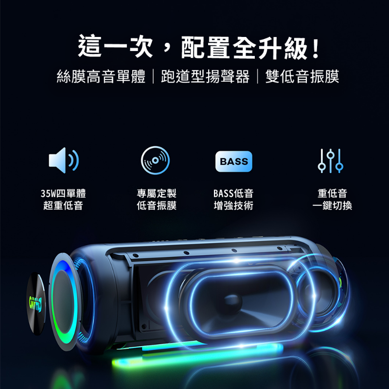 整合防水、續航與高音質設計於一體,提供強勁重低音、RGB 燈效、四音源輸入與電量顯示設計。