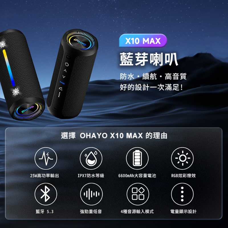 ✨【OHAYO X10 MAX|沉浸震撼音效】35W MAX 重低音 + 全天候續航 24H ✨ 盡情釋放音樂能量 🔊