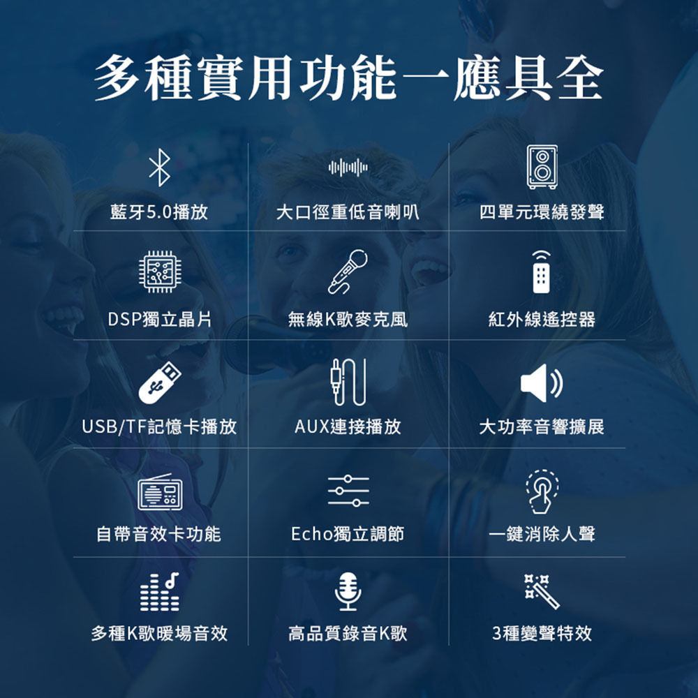 支援USB/TF卡播放與無線K歌,