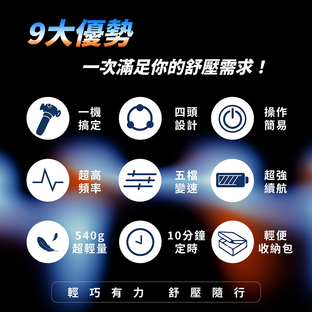 從五段變速、超高頻率到超輕量設計,九大功能完整支援日常使用。操作簡單、續航持久,搭配收納包更方便隨身攜帶,隨時隨地享受舒壓。