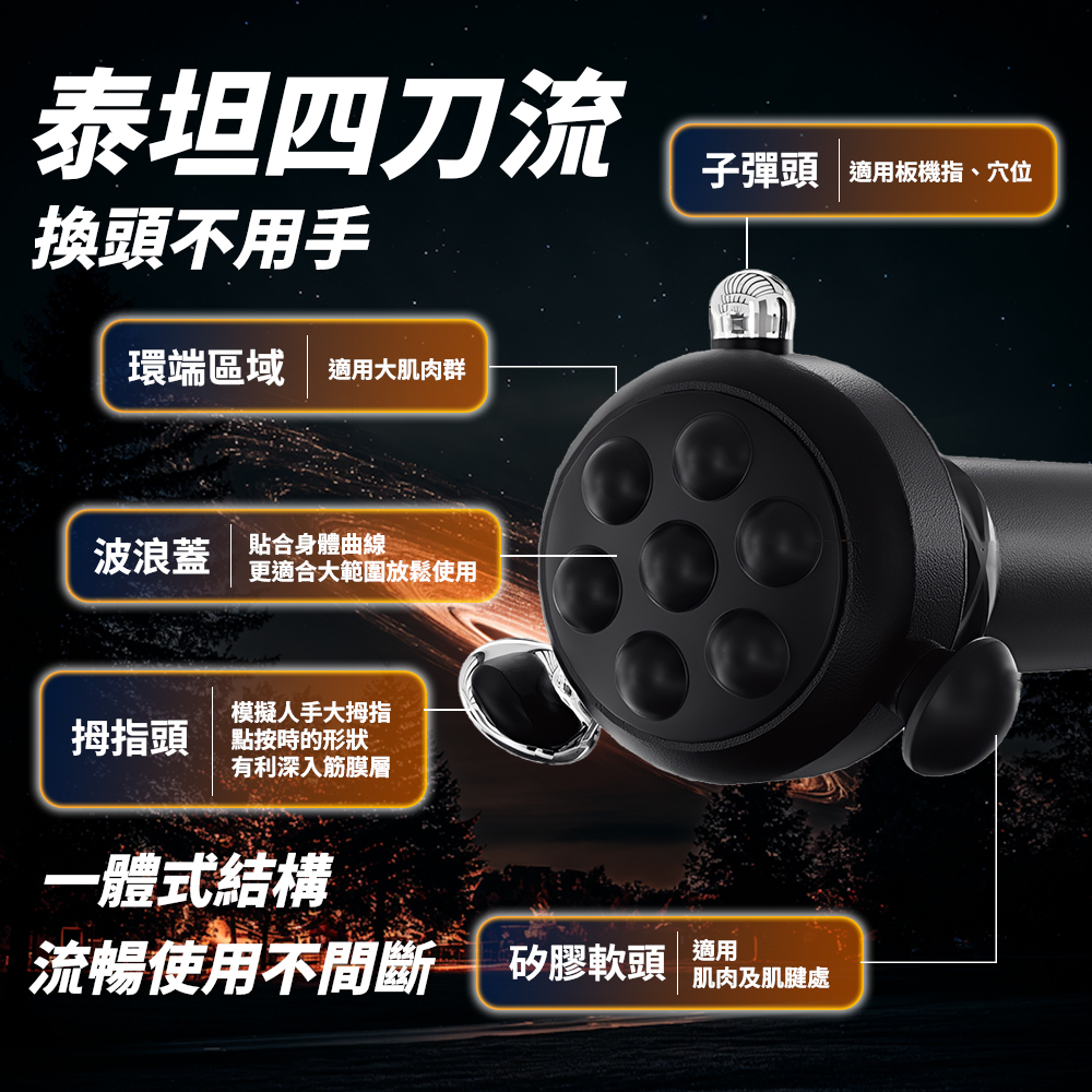 ● 矽膠頭:柔和觸感,適用於肌腱與敏感肌肉群