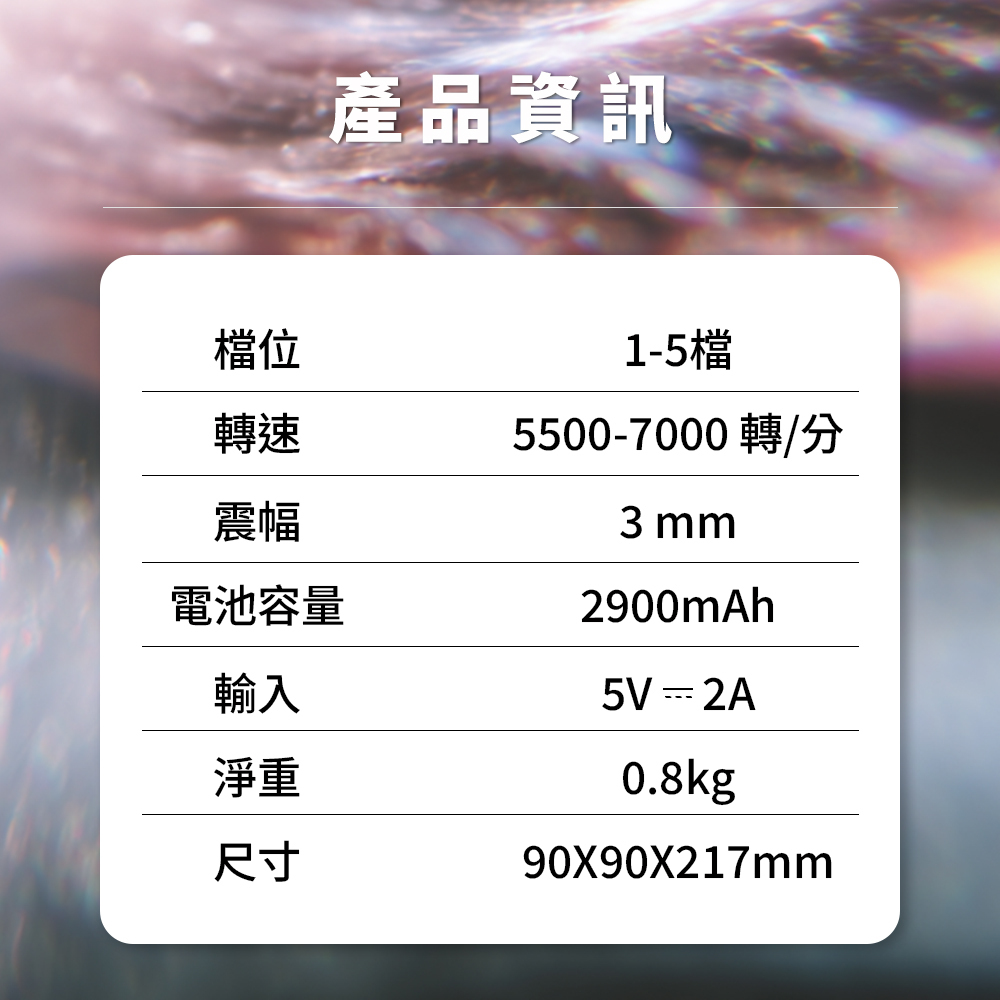 提供 1–5 檔變速,轉速 5500–7000 轉/分,震幅 3mm,搭載 2900mAh 電池,淨重 0.8kg,兼顧輕巧與穩定輸出。