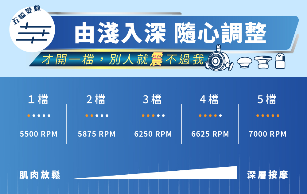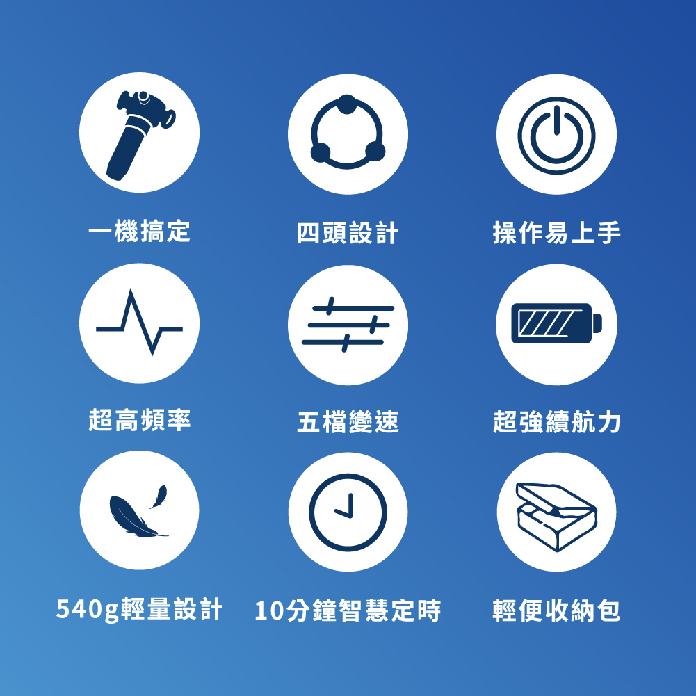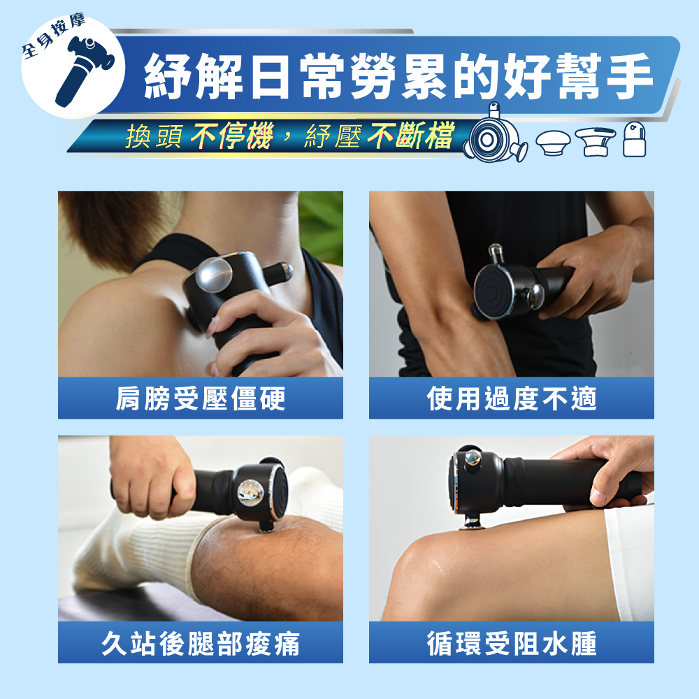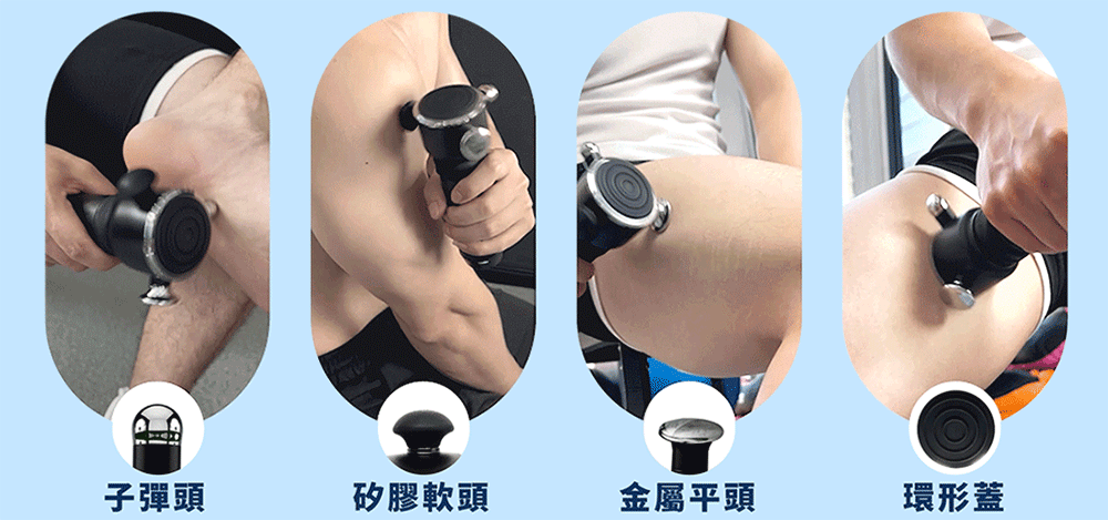 A:【全方位高頻槍】整合四種按摩頭於一機,無須替換按摩頭,精準又即時地掌握各部位的按摩需求。