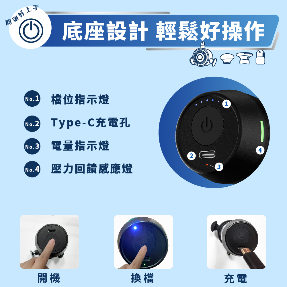 開機後短按底部的按鍵換檔,最低是一檔,最高是五檔。五段式換檔,按摩效果更精準。