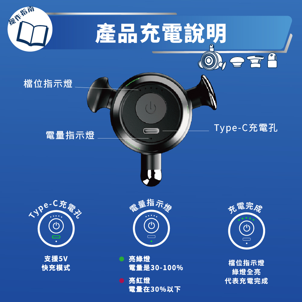 充電時,若產品上的檔位指示燈依序亮起 ,代表正在充電,電量未滿。當檔位指示燈全亮綠燈,代表已經充滿電。