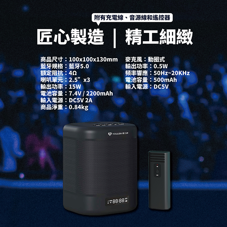| 內容物說明 | 音響×1、麥克風×1、遙控器×1、三環音源線×1、USB充電線×1、說明書×1 |