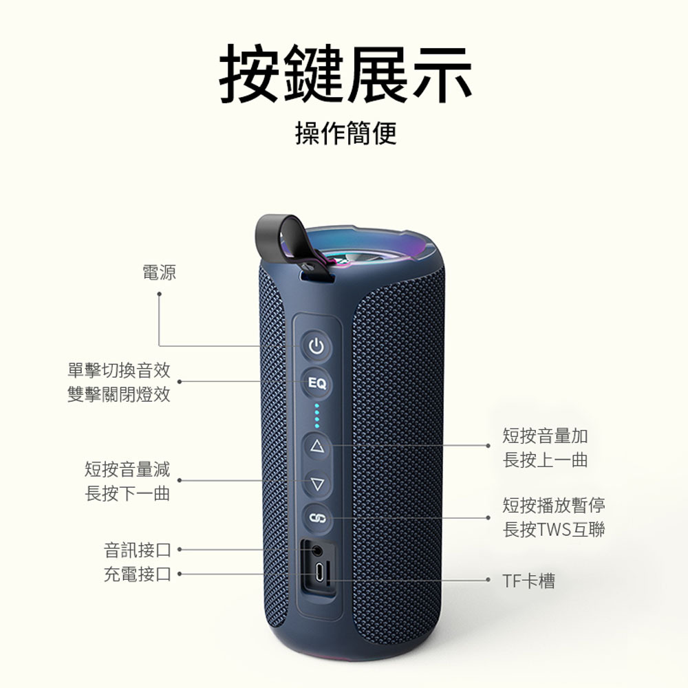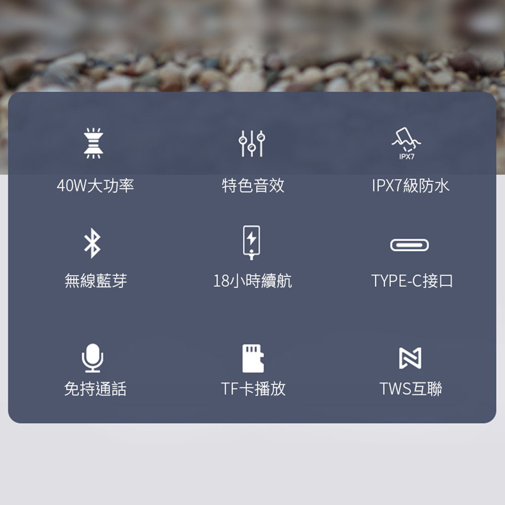 擁有IPX7防水、藍牙無線連線、18小時長效續航與TYPE-C快充,支援免持通話、TF卡播放、TWS互聯,功能一應俱全。