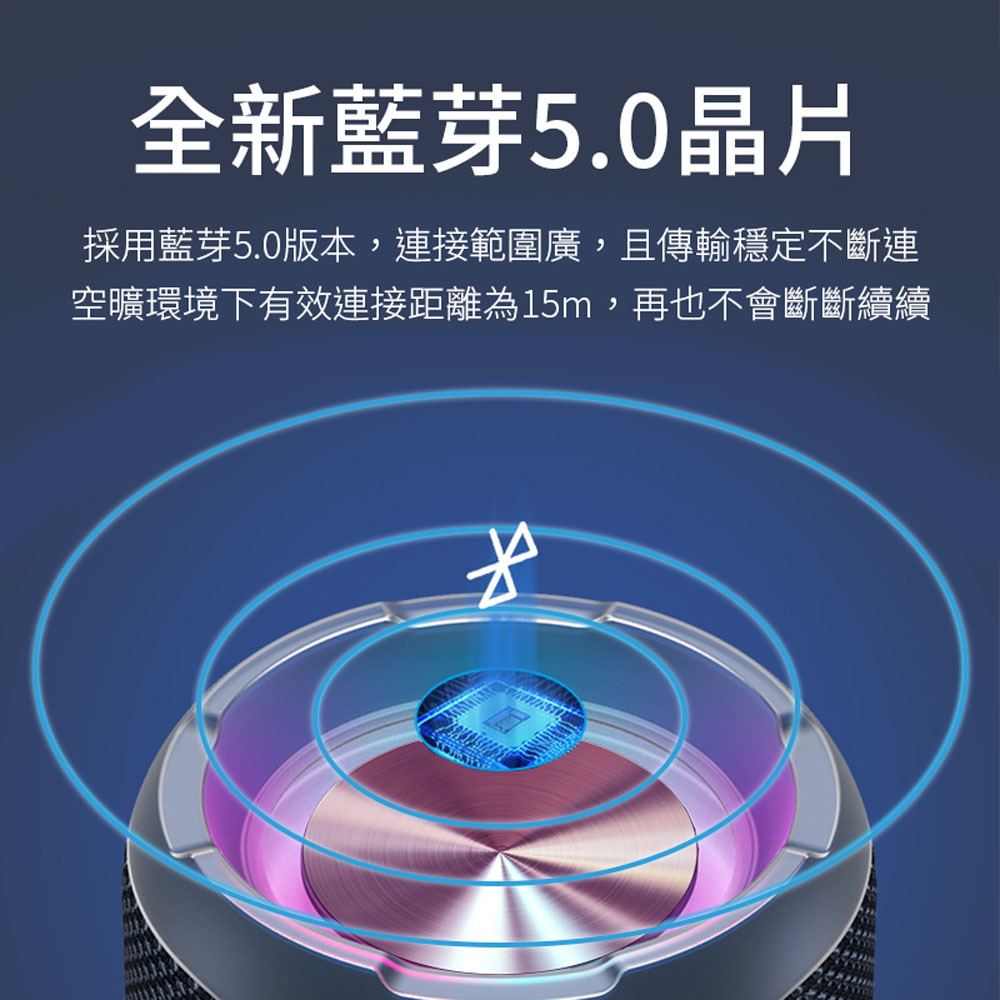 全新藍牙5.0晶片,空曠場景連線距離15米,不易斷線。支援藍牙、AUX、TF卡、TWS雙機串聯播放等多模式,使用方式彈性靈活。
