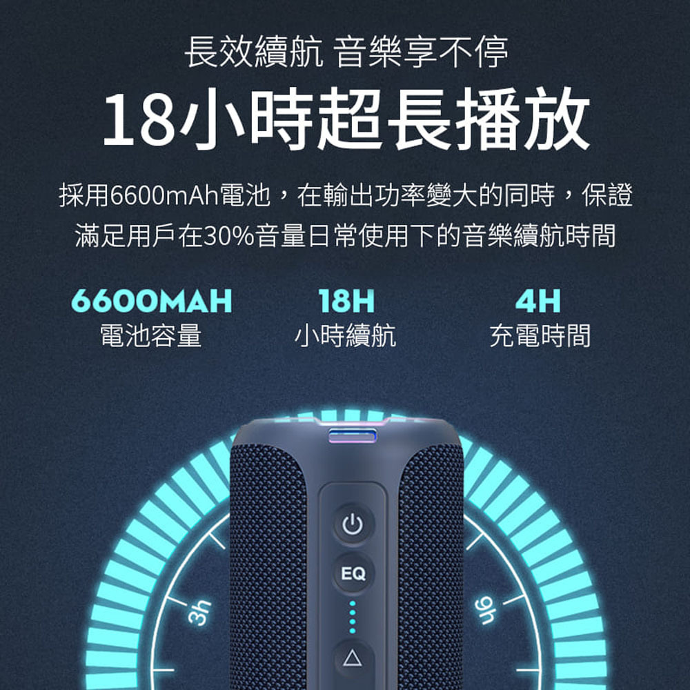 配備6600mAh電池,單次充電可連續播放18小時(30%音量測試),滿足全天候聽歌需求,隨時隨地都能嗨起來。