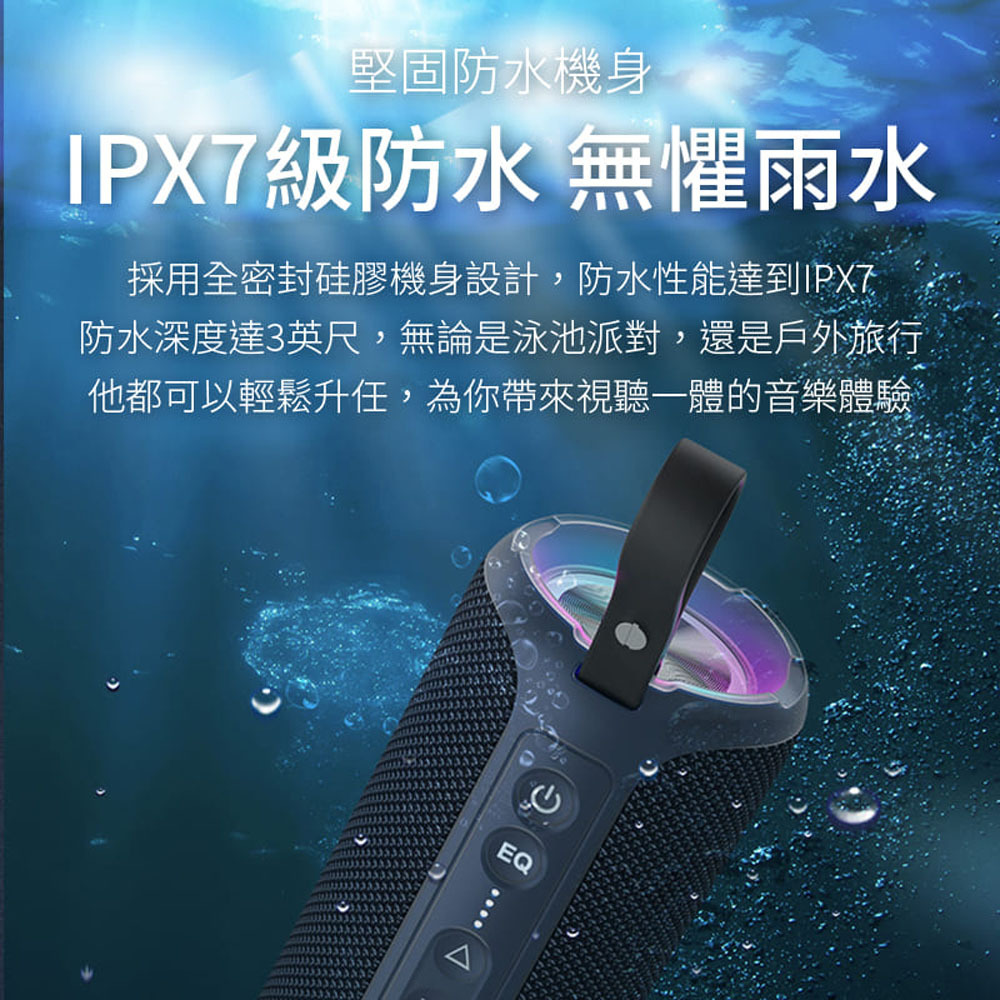 採用全密封矽膠設計,通過IPX7防水認證,深度3英尺也不怕濕。泳池、雨天、露營派對都能安心使用。
